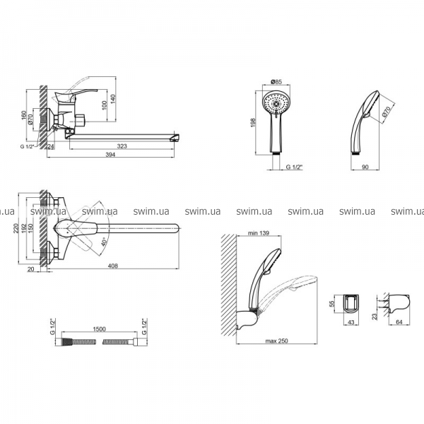 - Комплектация: смеситель, лейка для ручного душа, душевой шланг, кронштейн для ручного душа, крепежи.