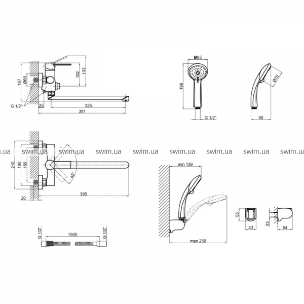 - В комплекте: смеситель, лейка для ручного душа, душевой шланг, кронштейн для ручного душа, крепежи