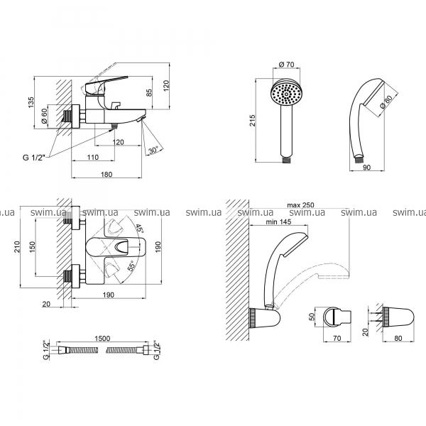 - Комплектация: смеситель, лейка для ручного душа, душевой шланг, кронштейн для ручного душа, крепежи.