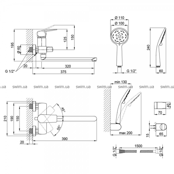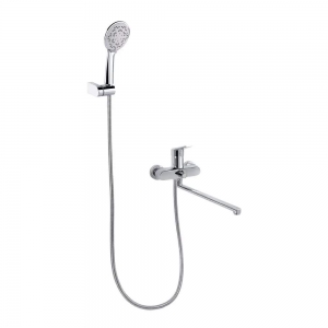 - Комплектация: смеситель, лейка для ручного душа, душевой шланг, кронштейн для ручного душа, крепежи.