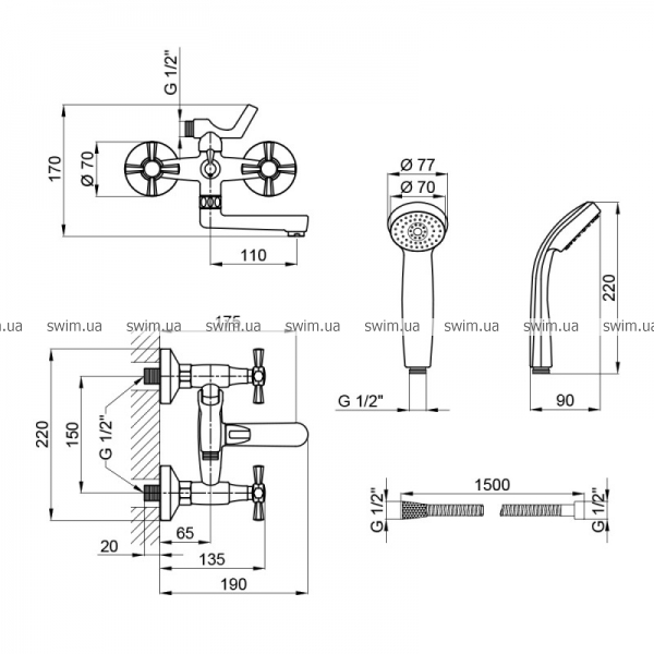 - В комплекте: смеситель, лейка для ручного душа, душевой шланг, кронштейн, крепежи