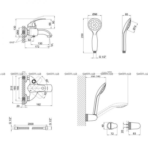 - Комплектация: смеситель, лейка для ручного душа, душевой шланг, кронштейн для ручного душа, крепежи