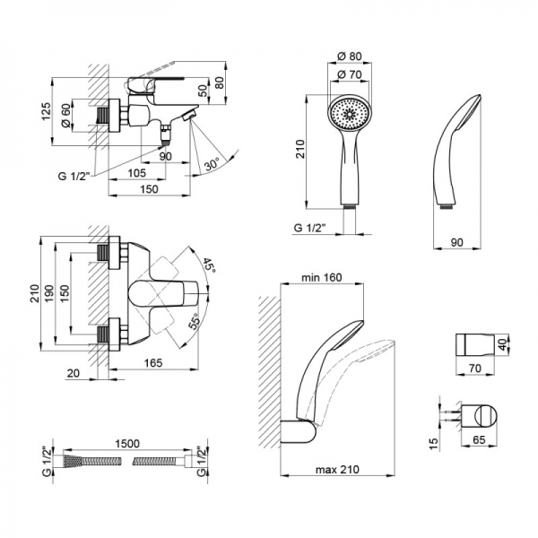 - Комплектация: смеситель, лейка для ручного душа, душевой шланг, кронштейн для ручного душа, крепежи