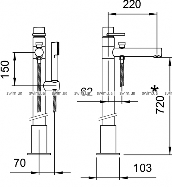 - С металлическим гибким шлангом 1500 мм и ручным душем Uno