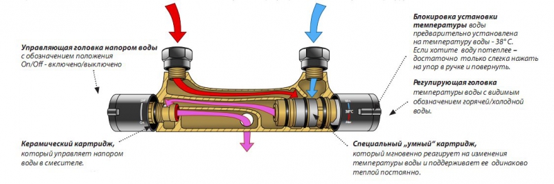 - Термостатический смеситель оборудован керамическим картриджем, который регулирует напор воды в смесителе, и термостатическим картриджем, который регулирует температуру воды.