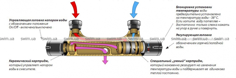 - Термостатический смеситель оборудован керамическим картриджем, который регулирует напор воды в смесителе, и термостатическим картриджем, который регулирует температуру воды.