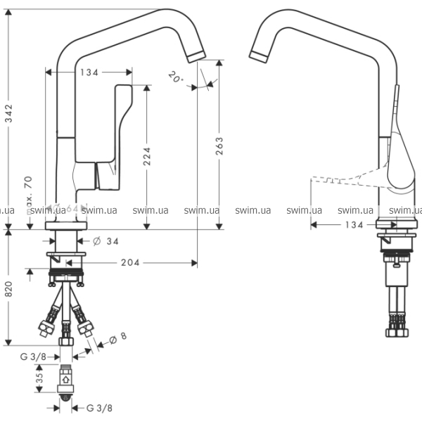 - угол поворота излива регулировка на 3 уровня 110°, 150° или 360°