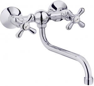 Змішувач оснащений двома хрестоподібними вентилями змішування та регулювання холодної – гарячої води. Обладнаний поворотним виливом плавно зігнутої форми з великим радіусом дії та збільшеним робочим простором, що дозволяє використовувати для мийок як з однією, так і двома чашами. Корпус змішувача виготовлений із екологічно чистого матеріалу (латунь).