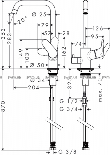 - угол поворота излива регулировка на 3 уровня на 110°, 150° или 360°