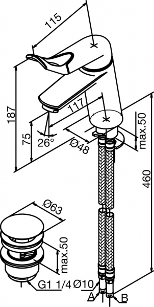 - Излив: высота 75 мм, длина 117 мм