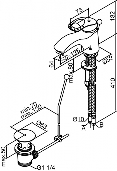 - Излив: высота 64 мм, длина 126 мм.