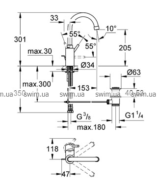 • Поворотный, трубкообразный излив с ограничителем поворота