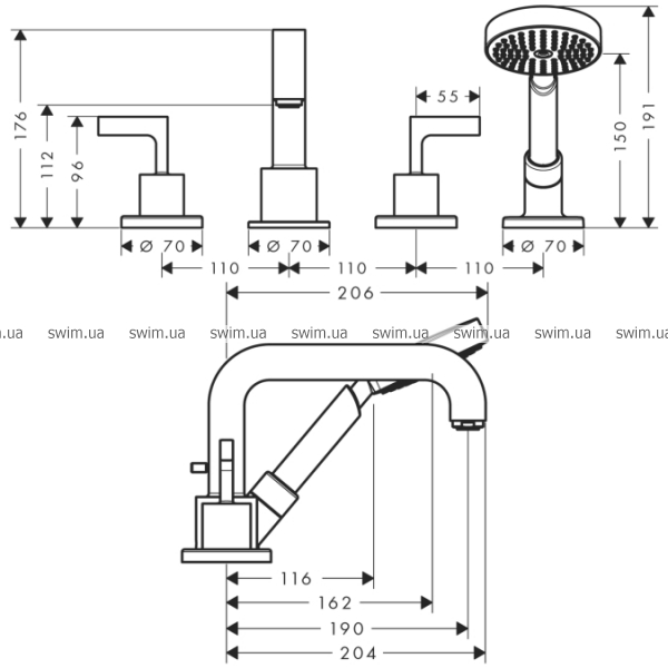 - комплект поставки: рукоятки, розетка, излив на ванну с переключателем, защита от обратного тока воды