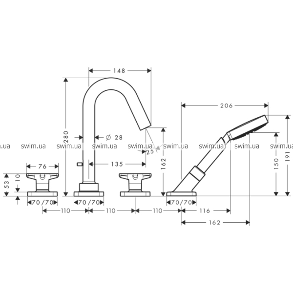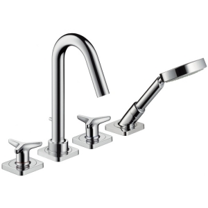 - комплект поставки: рукоятки, розетка, излив на ванну с переключателем, защита от обратного тока воды