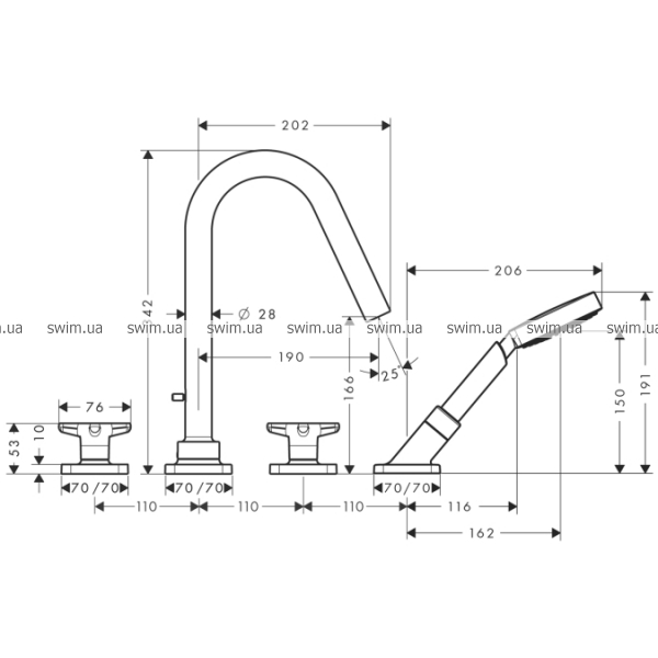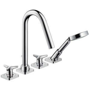 - комплект поставки: рукоятки, розетка, излив на ванну с переключателем, защита от обратного тока воды