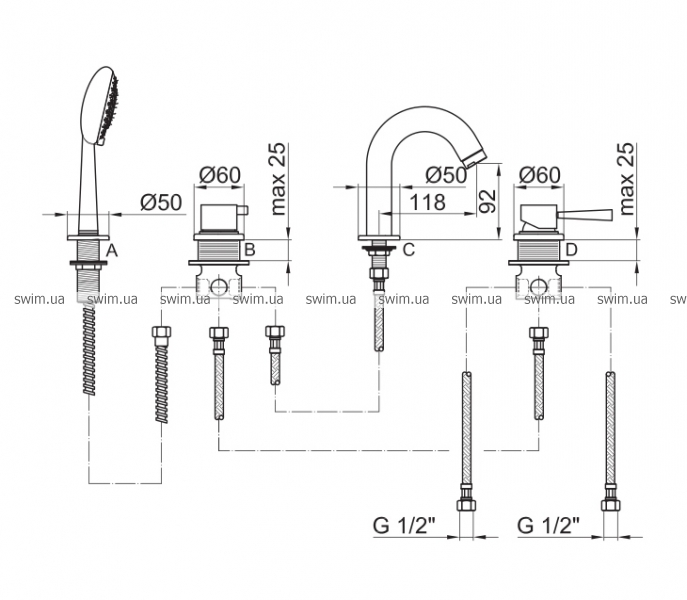 - Смеситель на борт ванны на 4 отверстия