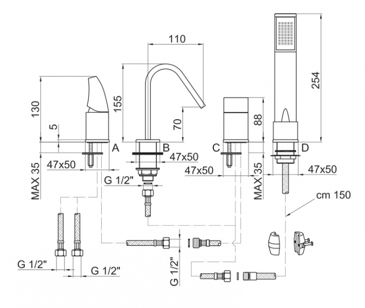 - Смеситель на борт ванны на 4 отверстия