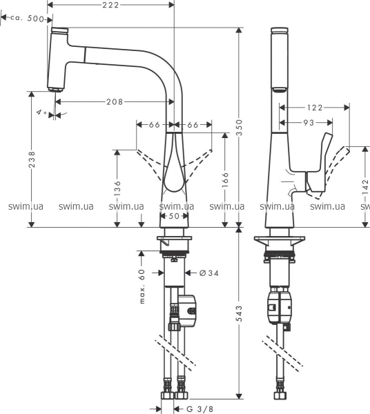 - угол поворота излива: регулировка на 2 уровня, на 110° или 150°