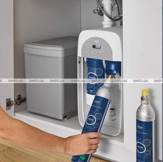 Стартовый комплект включает в себя однорычажный смеситель GROHE Blue и охладитель-карбонизатор, в котором располагаются фильтр и баллон CO2.