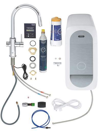 Набор включает в себя однорычажный смеситель GROHE Blue, а также охладитель-карбонизатор, который содержит фильтр и баллон Co2 для карбонизации. Охладитель-карбонизатор можно поставить в любой кухонный шкаф, ширина которого не меньше 30 см, что делает его идеальным вариантом для любой кухни, а фильтр и баллон CO@ в 425 г легко достать или заменить.