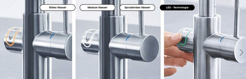 Управляйте своим смесителем также просто, как и своим смартфоном. Активируйте функцию фильтрованной воды GROHE Blue Home простым нажатием на LED-кнопку. Выберите питьевую воду и кнопка загорится синим, или нажмите на иконку газированной воды и кнопка загорится зеленым. Для слабо газированной воды просто сперва нажмите одну кнопку, а затем другую. LED-кнопка также покажет вам, когда придет время заменить фильтр или газовый баллон CO2.