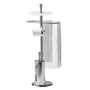 Стойка туалетная Colombo Design Isole B9408 комплектуется подставкой под аксессуары, вешалкой для полотенец, бумагодержателем и ершиком. Она изготовлена из высококачественного металла, который не боится влаги и не ржавеет. Ершик представляет собой съемную щетку с синтетическим ворсом и гладкую металлическую ручку с крышкой. Колба ершика имеет съемную внутреннею пластиковую емкость. Сборка проста и не потребует специальных навыков. Размеры стойки невелики и ее можно будет удобно разместить в любой ванной комнате.