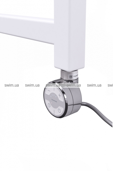 Круглий електричний ТЕН для рушникосушки TERMA MOA з спіральним кабелем, регулятором, індикаторами, таймером на 2 год. Має 5 режимів керування температурою в діапазоні від 30 до 60 °C. На поточний режим вказують сині індикатори.