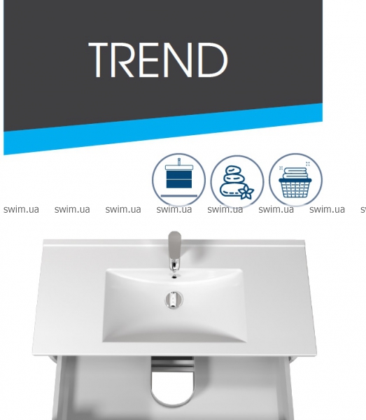 Тумба з умивальником «Trend» від MDD Group - це дизайнерське рішення для ванної кімнати. Оригінальні вигнуті форми фасаду і чудово виконані білі лакові поверхні тумби ідеально гармоніюють з іншими предметами ванної кімнати. Глибокий білий фарфоровий умивальник SU 80 Creavit (Туреччина) має додаткові поля, на яких можна розмістити косметику і засоби особистої гігієни. Нижній ящик призначений для великих предметів, верхній - має внутрішнє зонування, зручне для всіляких дрібниць. Trend 80 - це підвісна тумбочка з умивальником, яка виконана у вдалому поєднанням стильного дизайну і прекрасною функціональністю. Направляючі Hettich (Німеччина) забезпечують плавне закривання ящиків. Trend від MDD Group - це унікальна, надійна та якісна відповідь, на бажання купити тумбу з раковиною преміальної якості і незвичайного дизайну. Trend - це вологостійка тумбочка у ванну з тривалою гарантією від виробника (3 роки на меблі, 5 років на умивальник).