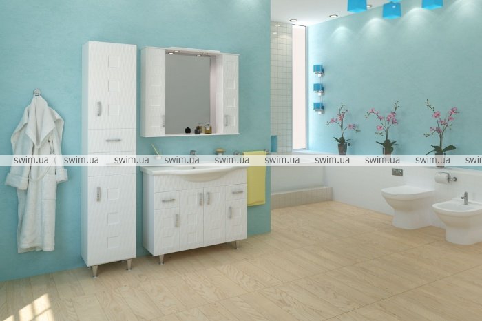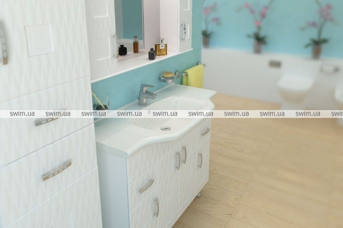 Мебель выглядит стильно и современно. Взгляд притягивает 3D фасад, который придаст уникальности любой ванной.