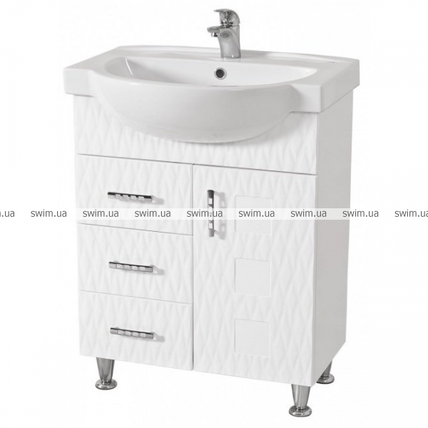 Тумба с умывальником - три ящика и одно большое отделение. Отличное решение для ванной комнаты. Позволит упорядочить ванные принадлежности и функционально использовать пространство. 3D фасад придаёт мебели для ванной уникальную огранку. Качественные материалы и комплектующие обеспечат вам комфорт в пользовании мебелью.