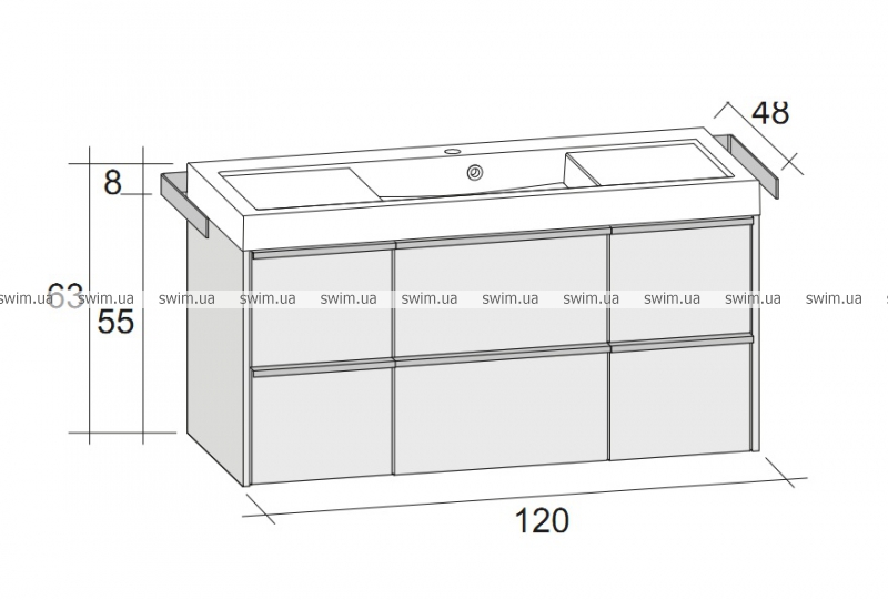 Размеры раковин: 120 см раковина - центральная, одно отверстие для смесителя; 160 см двойная раковина, два отверстия для смесителей
