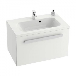 Белые глянцевые дверцы и хромированная ручка придают мебели изысканность.