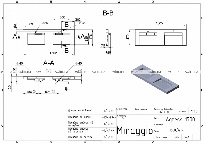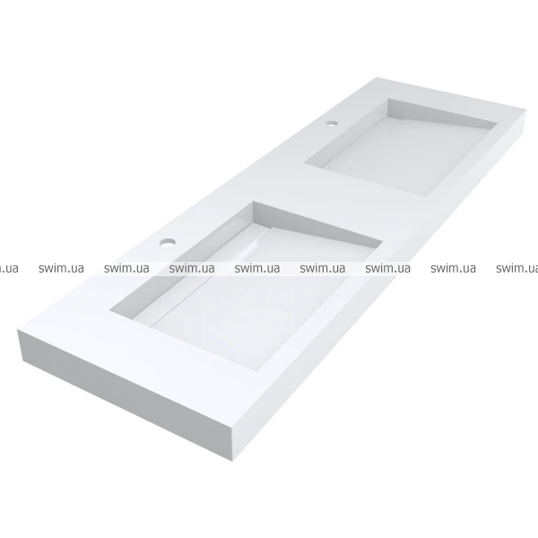 Плоский умивальник із литого мармуру AGNESS 1500 з двома прямокутними чашами без крил стане прекрасним доповненням ванної кімнати в стилі мінімалізм. Раковина має накладний спосіб монтажу та легко встановлюється на тумбу чи полицю в ванній кімнаті. На бортах умивальника можна розмістити косметичні засоби. Отвір під злив приховано декоративною накладкою. Сантехніка MIRAGGIO виробляється за авторською технологією змішування мармуровою крихти та поліефірної смоли в вакуумі. Матеріал умивальника - MIRAMARBLE. В його структурі відсутні мікропори, що виключає розвиток бактерій в товщі стінок. Додатково виріб покритий антибактеріальним гелем. Поверхня умивальника глянцева. Литий мармур відрізняється здатністю поглинати звуки води та приймати температуру довкілля. Завдяки цьому умивальник з литого мармуру безшумний, зручний та надійний. Він стійкий до температурних перепадів, забруднень та подряпин. Оптимальний температурний діапазон експлуатації виробу від -65 до +65 °C. Заводський стандарт моделі AGNESS 1500 передбачає відсутність переливів і два отвори під змішувач. Опціонально можна замовити умивальник з одним із них або зовсім без отворів. В комплекті постачається сифон. При необхідності, запасну накладку на злив можна замовити на сайті. Модель AGNESS 1500 також може бути виготовлена в технологіях MIRAMARBLE MATT і MIRASOFT.