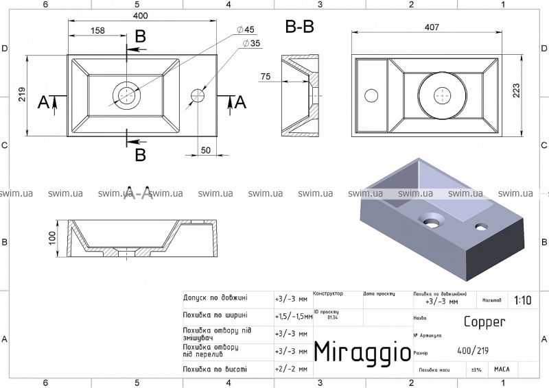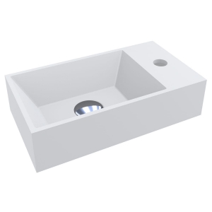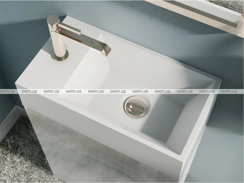 Прямокутний матовий умивальник із литого мармуру COPPER 400 з глибокою трапецієподібною чашею та крилом для засобів гігієни - зручний та витончений аксесуар ванної кімнати. Раковина передбачає окремий або настінний змішувач. Має накладний спосіб монтажу та легко встановлюється на тумбу або полицю. Сантехніка MIRAGGIO виробляється за авторською технологією змішування мармуровою крихти та поліефірної смоли в вакуумі. Матеріал умивальника - MIRAMARBLE MATT. В її структурі відсутні мікропори, що виключає розвиток бактерій в товщі стінок. Додатково виріб покритий антибактеріальним гелем. Продукція полірується пастою з матовим фінішем. Поверхня умивальника матова. Литий мармур відрізняється здатністю поглинати звуки води та приймати температуру довкілля. Завдяки цьому умивальник з литого мармуру безшумний, зручний та надійний. Він стійкий до температурних перепадів, забруднень та подряпин. Оптимальний температурний діапазон експлуатації виробу від -65 до +65 °C. Заводський стандарт моделі COPPER 400 не передбачає отвори під змішувач та перелив. За потреби можна замовити умивальник з отвором для змішувача. Опціонально донний клапан клік-клак можна замовити на сайті. Ви можете замовити кольорову раковину COPPER 400 з покриттям у будь-який відтінок на палітрі RAL. Покриття RAL наноситься тільки на зовнішній бік виробу відповідно до санітарних норм. Умивальник COPPER 400 також може бути виготовлений у технологіях MIRAMARBLE та MIRASOFT. Ознайомтесь з правилами експлуатації та догляду за виробами MIRAMARBLE MATT тут. Зверніть увагу, такі умивальники мають бархатисто-матову, але більш пористу поверхню порівняно з виробами MIRASOFT, тому потребують більш ретельного догляду.