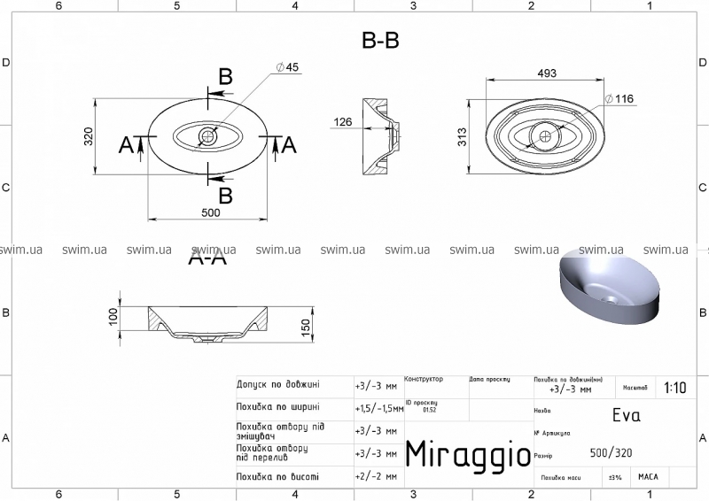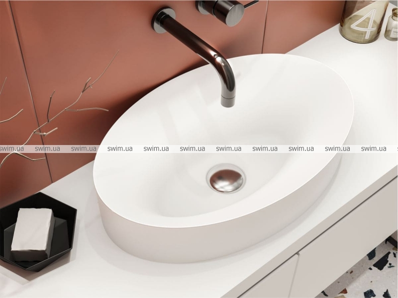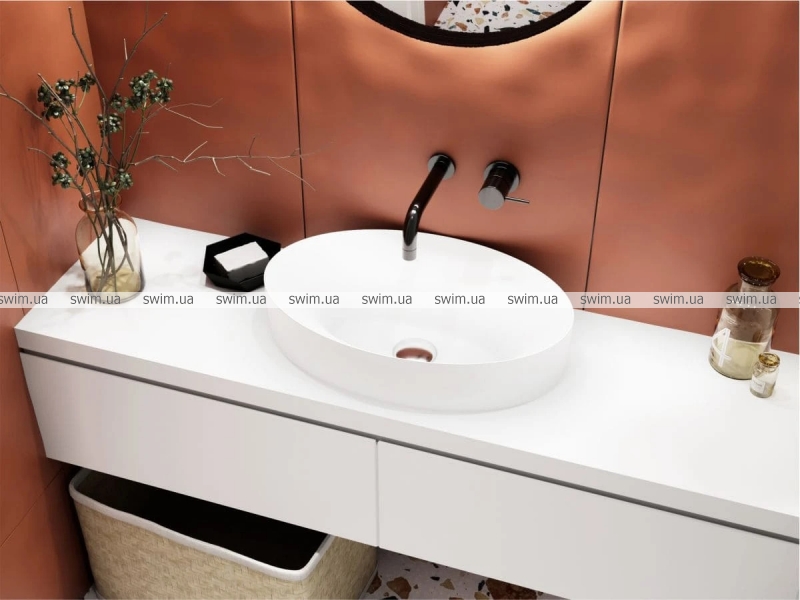 Овальний умивальник із литого мармуру EVA MATT - це поєднання масивності та плавних ліній. Неглибока чаша забезпечить функціональність та доповнить сучасний стиль ванної кімнати. Умивальник має врізний тип монтажу. Сантехніка MIRAGGIO виробляється за авторською технологією змішування мармурової крихти та поліефірної смоли у вакуумі. Матеріал умивальника – MIRAMARBLE. У його структурі відсутні мікропори, що виключає розвиток бактерій у товщі стінок. Додатково виріб покритий антибактеріальним гелем. Поверхня умивальника глянцева. Литий мармур відрізняється здатністю поглинати звуки води та приймати температуру навколишнього середовища. Завдяки цьому умивальник з литого мармуру безшумний, зручний і надійний. Він стійкий до температурних перепадів, забруднення та подряпин. Оптимальний температурний діапазон експлуатації виробу від -65 до +65 °C. Заводський стандарт моделі EVA MATT не передбачає отворів під змішувач та перелив. Опціонально донний клапан клік-клак можна замовити на сайті. Ви можете замовити кольорову раковину EVA MATT з покриттям у будь-який відтінок по палітрі RAL. Покриття RAL наноситься тільки на зовнішній бік виробу відповідно до санітарних норм. Умивальник EVA також може бути виготовлений в технологіях MIRAMARBLE MATT і MIRASOFT.