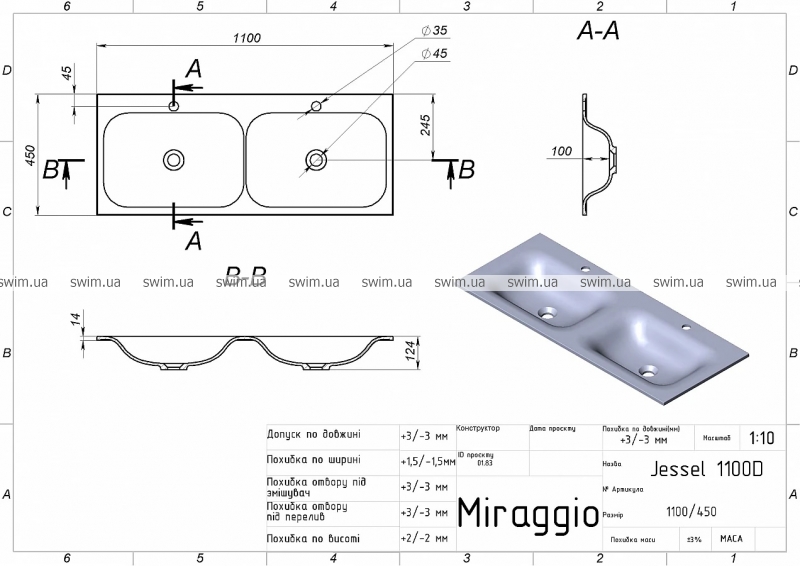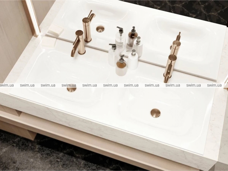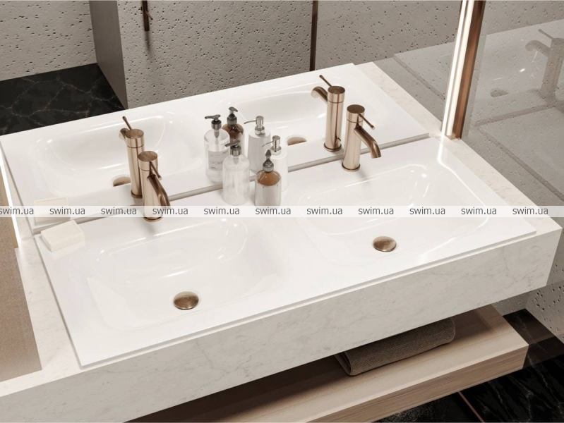 Подвійний меблевий умивальник із литого мармуру JESSEL 1100-2 - оптимальне рішення для великої родини. Плавні лінії чаш перешкоджають розбризкуванню води, широкі крила дозволяють зручно розмістити гігієнічні засоби. Умивальник має кілька типів монтажу - накладний та врізний. Сантехніка MIRAGGIO виробляється за авторською технологією змішування мармуровою крихти та поліефірної смоли в вакуумі. Матеріал умивальника - MIRAMARBLE. В його структурі відсутні мікропори, що виключає розвиток бактерій в товщі стінок. Додатково виріб покритий антибактеріальним гелем. Поверхня умивальника глянцева. Литий мармур відрізняється здатністю поглинати звуки води та приймати температуру довкілля. Завдяки цьому умивальник з литого мармуру безшумний, зручний та надійний. Він стійкий до температурних перепадів, забруднень та подряпин. Оптимальний температурний діапазон експлуатації виробу від -65 до +65 °C. Заводський стандарт моделі JESSEL 1100-2 передбачає отвір для кожного змішувача. Опціонально можна замовити умивальник з одним із них або зовсім без отворів. Додатково донний клапан клік-клак можна замовити на сайті. Умивальник JESSEL 1100-2 також може бути виготовлений у технологіях MIRAMARBLE MATT та MIRASOFT.