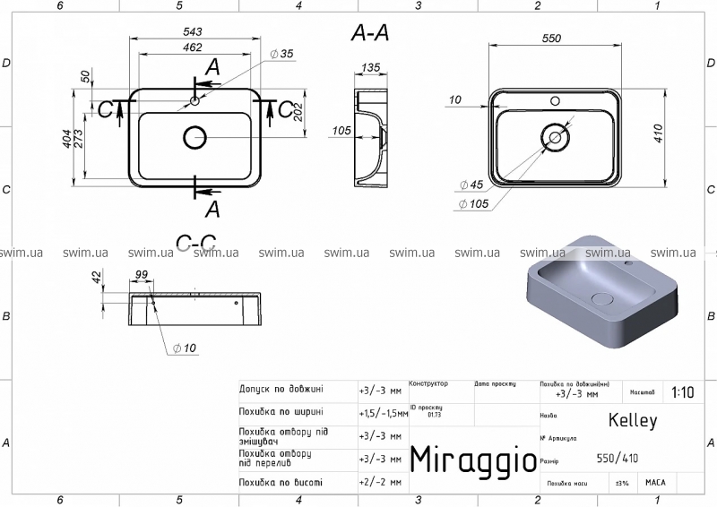 Умивальник Miraggio Kelley 550 MATT 55х41 см