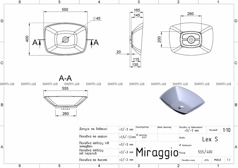 Трапецієподібна раковина з литого мармуру LEX S – ідеальний аксесуар для компактної ванної кімнати. Тонкі стіни, виразна глибока чаша підкреслять практичну роль умивальника в інтер єрі. Раковина передбачає окремий або настінний змішувач. Має накладний тип монтажу. Сантехніка MIRAGGIO виробляється за авторською технологією змішування мармуровою крихти та поліефірної смоли в вакуумі. Матеріал умивальника - MIRAMARBLE. В його структурі відсутні мікропори, що виключає розвиток бактерій в товщі стінок. Додатково виріб покритий антибактеріальним гелем. Поверхня умивальника глянцева. Литий мармур відрізняється здатністю поглинати звуки води та приймати температуру довкілля. Завдяки цьому умивальник з литого мармуру безшумний, зручний та надійний. Він стійкий до температурних перепадів, забруднень та подряпин. Оптимальний температурний діапазон експлуатації виробу від -65 до +65 °C. Заводський стандарт моделі LEX S не передбачає отвори під змішувач та перелив. Додатково донний клапан клік-клак можна замовити на сайті. Ви можете замовити кольорову раковину LEX S із покриттям у будь-який відтінок на палітрі RAL. Покриття RAL наноситься тільки на зовнішній бік виробу відповідно до санітарних норм. Умивальник LEX S також може бути виготовлений у технологіях MIRAMARBLE MATT, MIRASOFT та MIRASTONE (у сірому чи чорному кольорі).