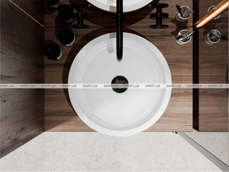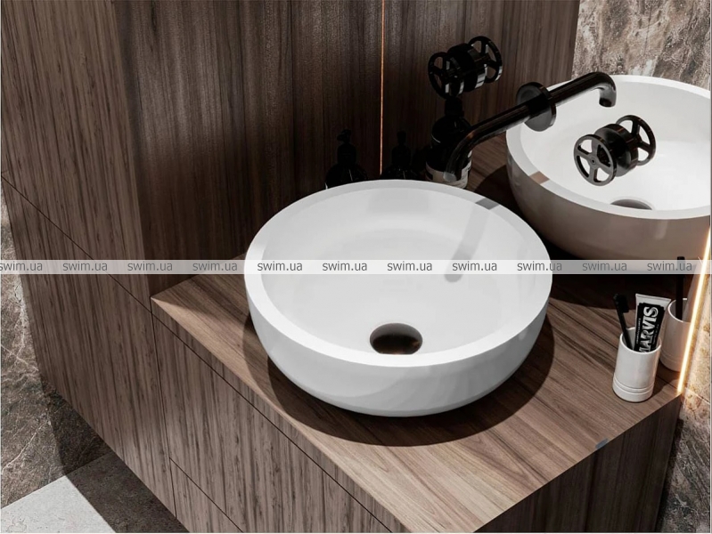 Компактний круглий умивальник з литого мармуру MARK 375 - привабливе та функціональне рішення для маленької ванної кімнати. Передбачає окремостоячий або настінний змішувач. Має накладний тип монтажу. Сантехніка MIRAGGIO виробляється за авторською технологією змішування мармуровою крихти та поліефірної смоли в вакуумі. Матеріал умивальника - MIRAMARBLE. В його структурі відсутні мікропори, що виключає розвиток бактерій в товщі стінок. Додатково виріб покритий антибактеріальним гелем. Поверхня умивальника глянцева. Литий мармур відрізняється здатністю поглинати звуки води та приймати температуру довкілля. Завдяки цьому умивальник з литого мармуру безшумний, зручний та надійний. Він стійкий до температурних перепадів, забруднень та подряпин. Оптимальний температурний діапазон експлуатації виробу від -65 до +65 °C. Заводський стандарт моделі MARK 375 не передбачає отвори під змішувач та перелив. Опціонально донний клапан клік-клак можна замовити на сайті. Ви можете замовити кольорову раковину MARK 375 з покриттям у будь-який відтінок на палітрі RAL. Покриття RAL наноситься тільки на зовнішній бік виробу відповідно до санітарних норм. Умивальник MARK 375 також може бути виготовлений у технологіях MIRAMARBLE MATT та MIRASOFT.