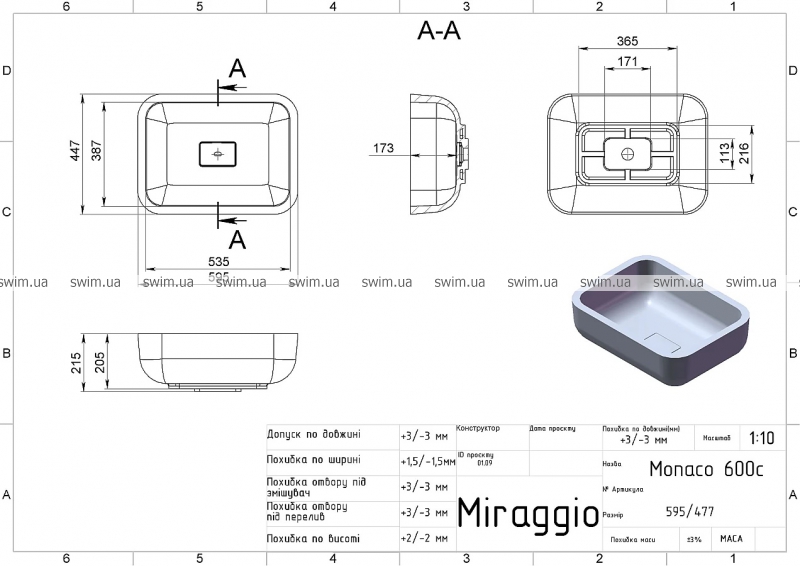 Умивальник із литого мармуру MONACO – стане привабливим елементом у будь-якому інтер єрі. Лаконічна форма та потовщені стінки раковини символізують самостійність та ґрунтовність. Передбачає окремий або настінний змішувач. Отвір під слив прихований декоративною накладкою. Умивальник має накладний тип монтажу. Сантехніка MIRAGGIO виробляється за авторською технологією змішування мармуровою крихти та поліефірної смоли в вакуумі. Матеріал умивальника - MIRAMARBLE. В його структурі відсутні мікропори, що виключає розвиток бактерій в товщі стінок. Додатково виріб покритий антибактеріальним гелем. Поверхня умивальника глянцева. Литий мармур відрізняється здатністю поглинати звуки води та приймати температуру довкілля. Завдяки цьому умивальник з литого мармуру безшумний, зручний та надійний. Він стійкий до температурних перепадів, забруднень та подряпин. Оптимальний температурний діапазон експлуатації виробу від -65 до +65 °C. Заводський стандарт моделі MONACO не передбачає отвори під змішувач та перелив. При необхідності запасну накладку на злив можна замовити на сайті. Ви можете замовити кольорову раковину MONACO з покриттям у будь-який відтінок на палітрі RAL. Покриття RAL наноситься тільки на зовнішній бік виробу відповідно до санітарних норм. Умивальник MONACO також може бути виготовлений у технологіях MIRAMARBLE MATT та MIRASOFT.