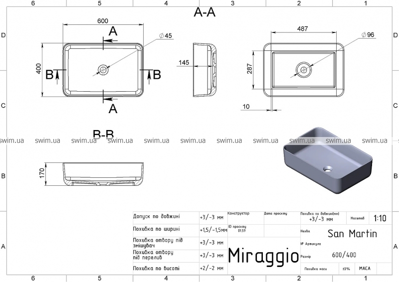 Умивальник із литого мармуру SAN MARTIN підкорює серця з першого погляду. Раковина має форму м якого прямокутника, витончені стінки здаються тонкими як порцеляна. Умивальник виглядає стильно у будь-якому інтер єрі. Передбачає окремий або настінний змішувач. Має накладний тип монтажу. Сантехніка MIRAGGIO виробляється за авторською технологією змішування мармуровою крихти та поліефірної смоли в вакуумі. Матеріал умивальника - MIRAMARBLE. В його структурі відсутні мікропори, що виключає розвиток бактерій в товщі стінок. Додатково виріб покритий антибактеріальним гелем. Поверхня умивальника глянцева. Литий мармур відрізняється здатністю поглинати звуки води та приймати температуру довкілля. Завдяки цьому умивальник з литого мармуру безшумний, зручний та надійний. Він стійкий до температурних перепадів, забруднень та подряпин. Оптимальний температурний діапазон експлуатації виробу від -65 до +65 °C. Заводський стандарт моделі SAN MARTIN не передбачає отвори під змішувач та перелив. Опціонально донний клапан клік-клак можна замовити на сайті. Ви можете замовити кольорову раковину SAN MARTIN із покриттям у будь-який відтінок на палітрі RAL. Покриття RAL наноситься тільки на зовнішній бік виробу відповідно до санітарних норм. Умивальник SAN MARTIN також може бути виготовлений у технологіях MIRAMARBLE MATT та MIRASOFT.