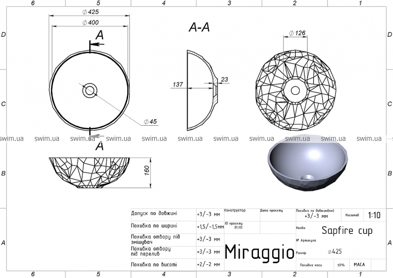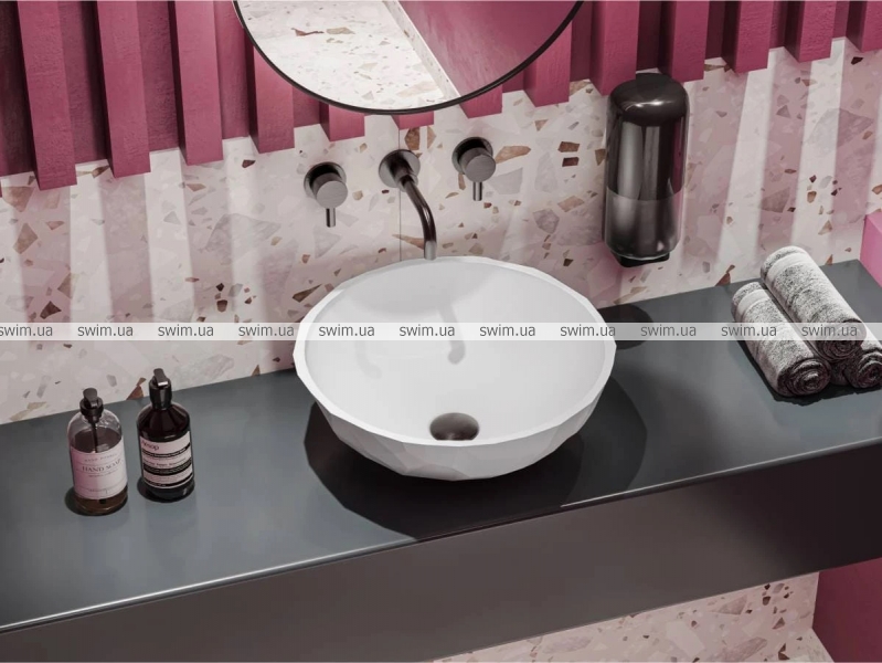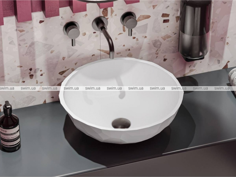 Чашеподібний умивальник з литого мармуру SAPFIRE – новинка 2022 року! Оригінальна напівсфера, огранована немов дорогоцінний камінь на зовнішній стороні стане чудовою прикрасою ванної кімнати. Раковина передбачає окремий або настінний змішувач. Умивальник має накладний тип монтажу. Сантехніка MIRAGGIO виробляється за авторською технологією змішування мармуровою крихти та поліефірної смоли в вакуумі. Матеріал умивальника - MIRAMARBLE. В його структурі відсутні мікропори, що виключає розвиток бактерій в товщі стінок. Додатково виріб покритий антибактеріальним гелем. Поверхня умивальника глянцева. Литий мармур відрізняється здатністю поглинати звуки води та приймати температуру довкілля. Завдяки цьому умивальник з литого мармуру безшумний, зручний та надійний. Він стійкий до температурних перепадів, забруднень та подряпин. Оптимальний температурний діапазон експлуатації виробу від -65 до +65 °C. Заводський стандарт моделі SAPFIRE не передбачає отворів під змішувач та перелив. Опціонально донний клапан клік-клак можна замовити на сайті. Ви можете замовити кольорову раковину SAPFIRE з покриттям у будь-який відтінок на палітрі RAL. Покриття RAL наноситься тільки на зовнішній бік виробу відповідно до санітарних норм. Умивальник SAPFIRE також може бути виготовлений у технології MIRAMARBLE MATT.