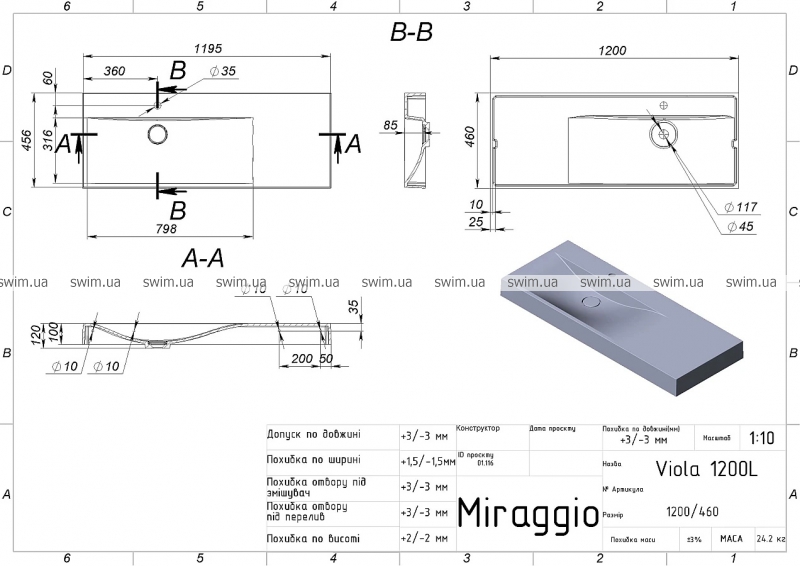 Умивальник Miraggio VIOLA 1200 L MIRASOFT 120х46 см