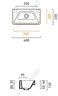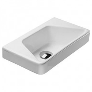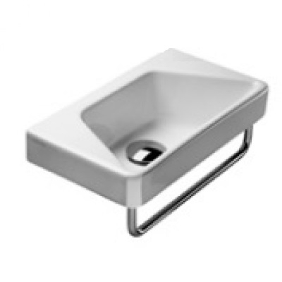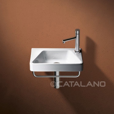 Рукомойник имеет подвесную установку, полувстраемую или на мебели, без слива/перелива. Предусмотрен для настольных кранов правх или левых или для настенных кранов. Может иметь фронтальный полотенцедержатель из хромированной латуни.