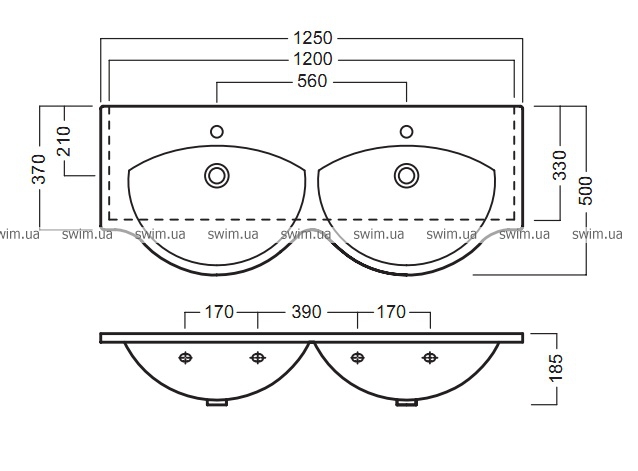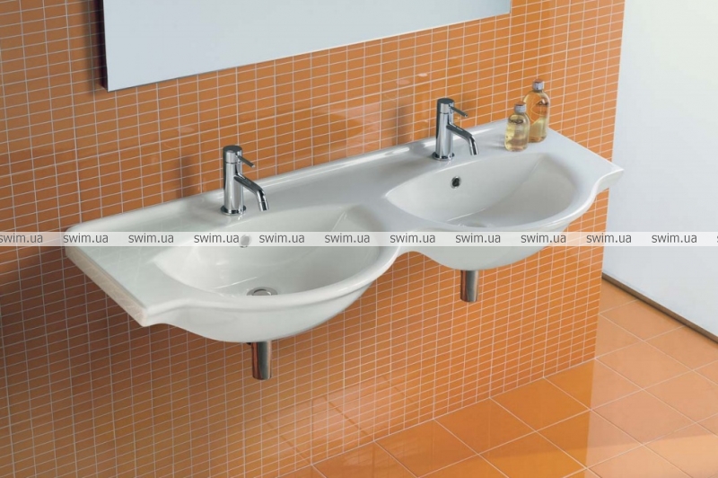Двойной умывальник с одним отверстием. Установка на мебель или на стену с помощью крепления.