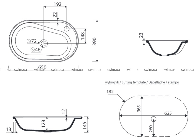 - Габаритные размеры раковины: 650x390x145 мм