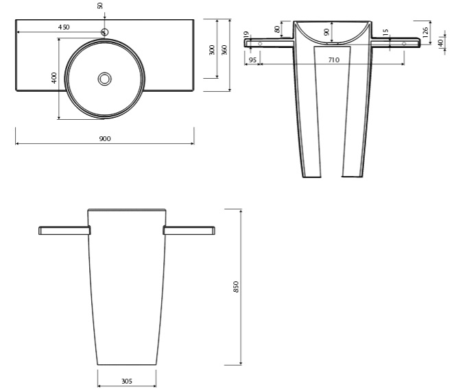 - Габаритные размеры раковины: 900х360х850 мм