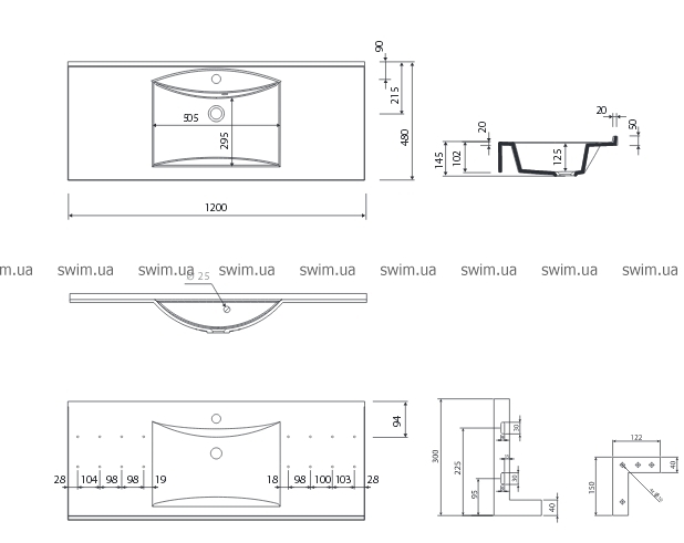- Габаритные размеры раковины: макс. 1200 / мин. 600х480х145 мм