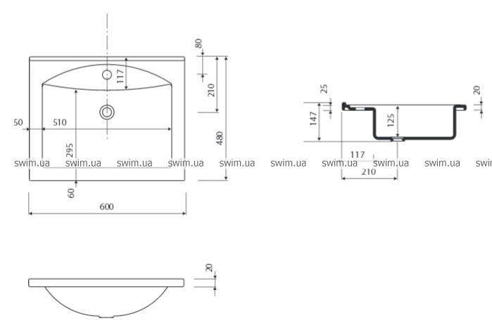 - Габаритные размеры раковины: 600x480x147 мм