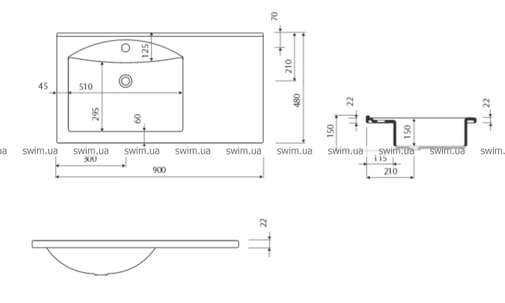 - Габаритные размеры раковины: 900x480x150 мм